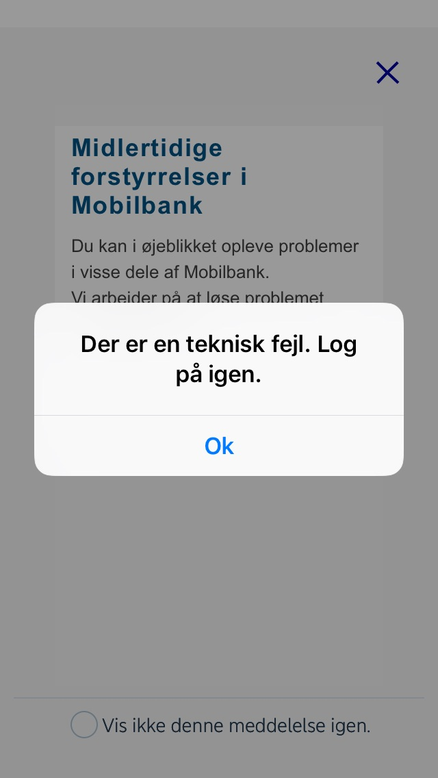 "Kære kunder. Vi oplever desværre nogle tekniske udfordringer, der påvirker net- og mobilbanken. Flere oplever dog at login på mobilbanken fungerer, men tager længere tid end normalt. Vi knokler for at løse det. Følg med her på siden for seneste opdatering."