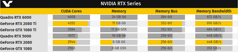 Det akkompagneres af den 11GB VRAM baseret på den nyere GDDR6 teknologi, som igennem en 352-bit forbindelse sikrer en hukommelses båndbredde på 616 GB/s, 27 procent højere end i 1080 Ti.