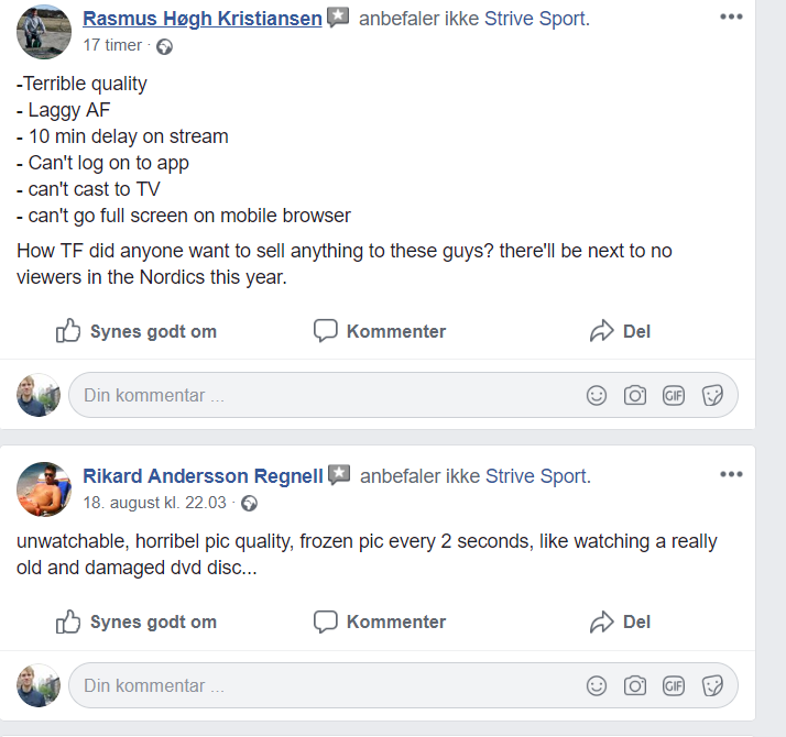 En lang række frustrerede brugere brokker sig på Strives Facebookside over, at der ikke streames i broadcast tv-kvalitet med 50 billeder per sekund, men kun det halve, ligesom den mængde billeddata, der streames, heller ikke lever op til brugernes forventninger.
