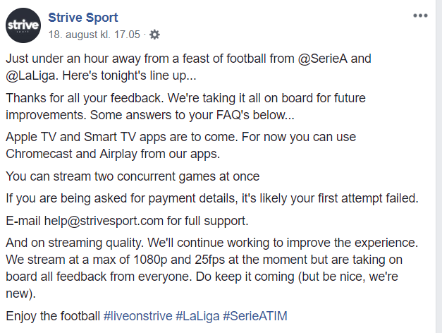 Den nye nordiske streamingtjeneste Strive, der udelukkende viser kampe fra de bedste fodboldligaer i Spanien og Italien, fik ikke verdens heldigste debut, hvis man skal tro tjenestens brugere.