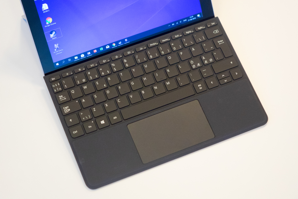 Vigtigste tilbehør til Surface Go er dog det skræddersyede Type Cover – et cover der på magnetisk vis giver både beskyttelse til skærmen, et tastatur og en relativ stor touchpad.