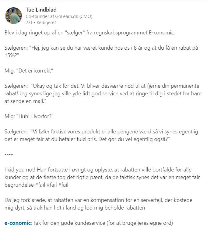 "Vi føler faktisk, vores produkt er alle pengene værd, så vi synes egentlig, det er meget fair, at du betaler fuld pris. Det gør du vel egentlig også?," lød det ifølge Linkedin-opslaget fra kundeservicemedarbejderen, der angiveligt også fortalte, at rabatordningerne ville bortfalde for alle Visma e-conomics kunder.