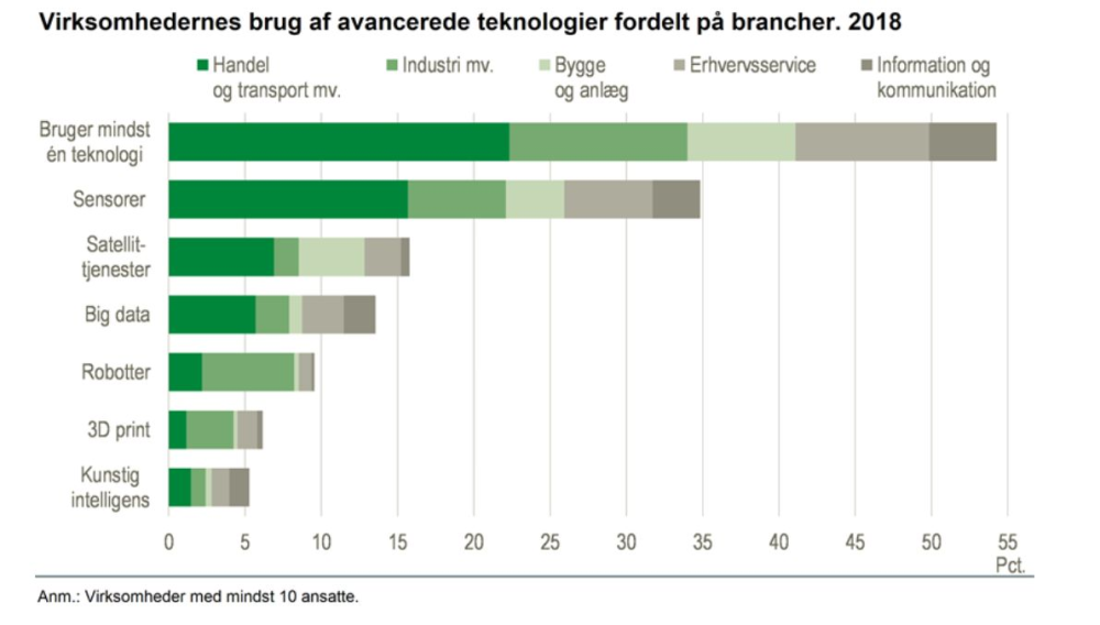 Ifølge Danmarks Statistik er handel- og transport-brancherne de brancher, hvor flest virksomheder anvender de pågældende teknologier.