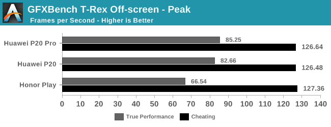 I en enkel grafik-præget disciplin, GFXBench’s ’T-rex Offscreen’, opnås ekstreme udsving.
