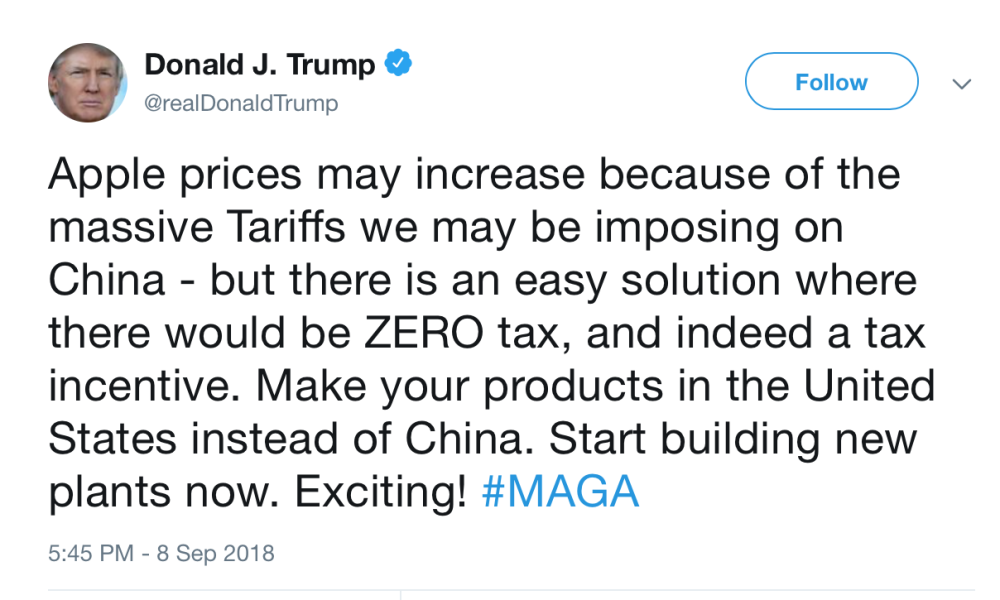 ”Lav jeres produkter i USA i stedet for Kina. Byg nye fabrikker nu. Spændende,” skrev præsidenten på Twitter.