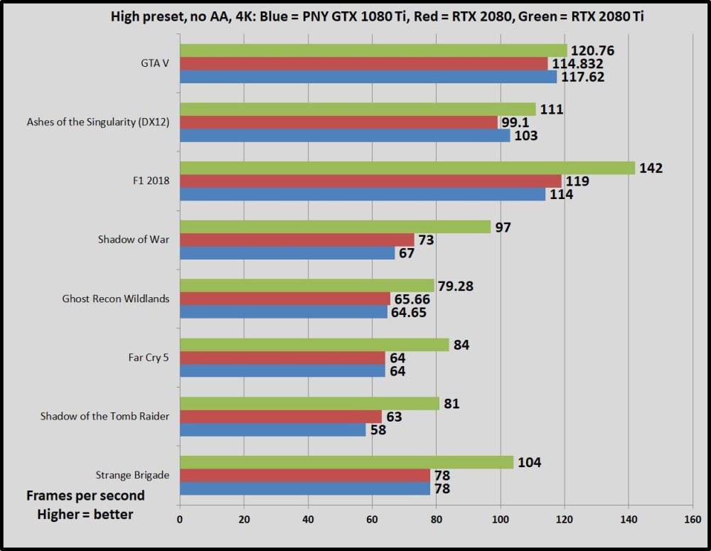 Her leverer RTX serien varen i de otte testede spildiscipliner hvor ingen af de nye kort på noget tidspunkt passerer under 60 fps grænsen i gennemsnit. Det er til trods for, at samtlige spil er sat til en høj detaljegrad. AA-effekter er dog slået fra, da de sjældent er nødvendige på så de skarpe 4K-skærme.