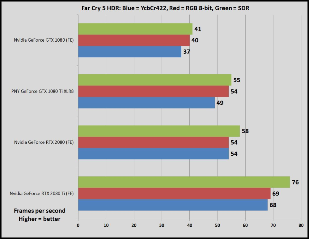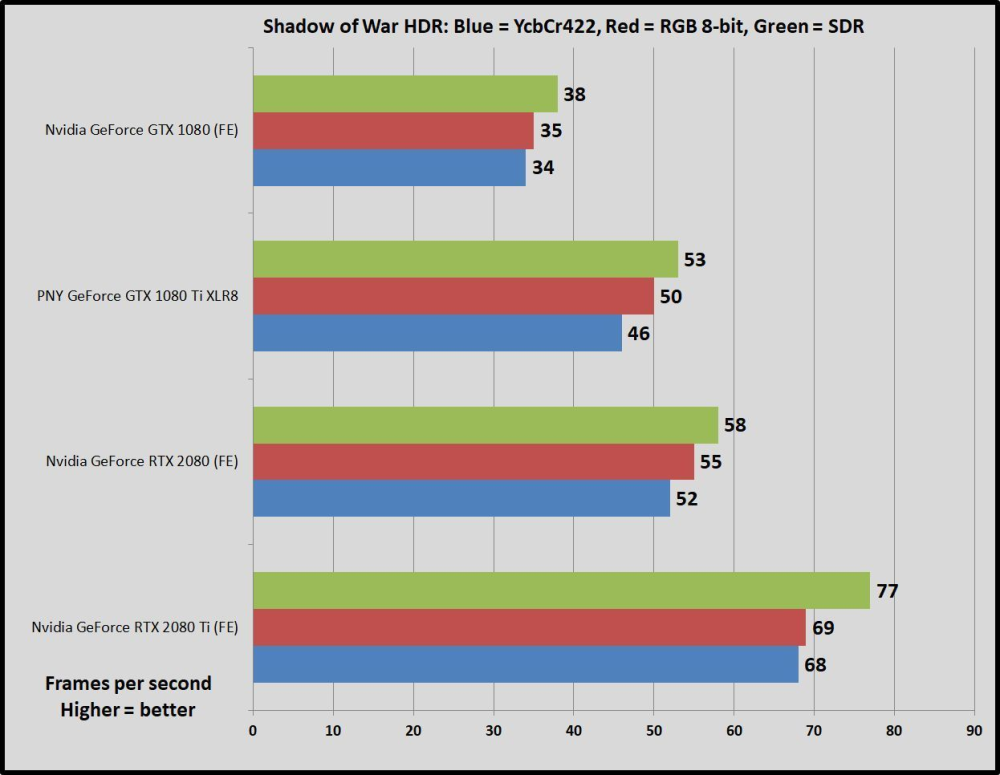 Når det gælder HDR-spil, løfter RTX serien sig også over sidste års topscorere i disciplinen. Når 4K og HDR slås til samtidigt begynder lillebror RTX 2080 at halse efter Ti-varianten.