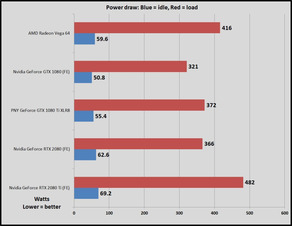Hvor GTX 1080 Ti kunne finde på at sluge op til 372 watt ved stikkontakten, trækker RTX 2080 Ti nu op til voldsomme 482 watt når den folder sig helt ud.