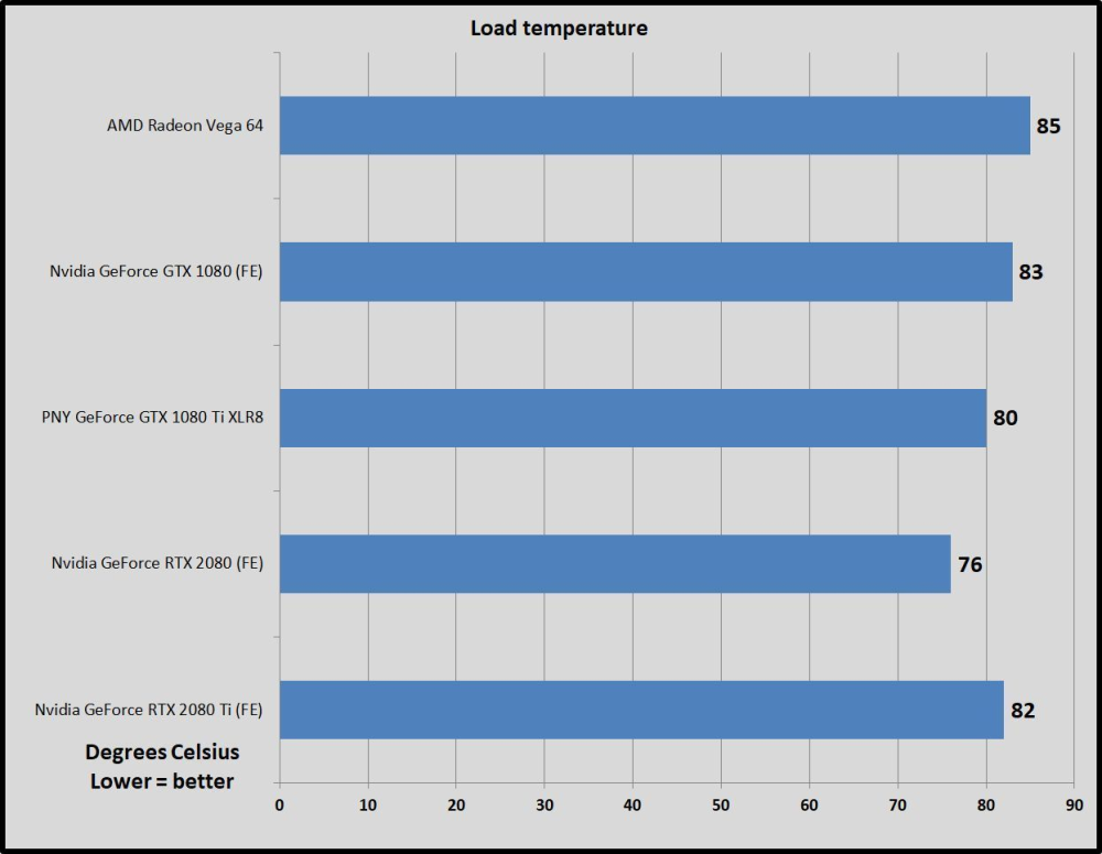 Det giver pludseligt mening, at Nvidia inkluderer en ny, fuldt optimeret køler med deres nye kort. Det voldsomme strømforbrug er heldigvis succesfuldt tøjlet, med driftstemperaturer som holder sig på den pæne side af henholdsvis 76 og 82 grader for RTX 2080 og RTX 2080 Ti.