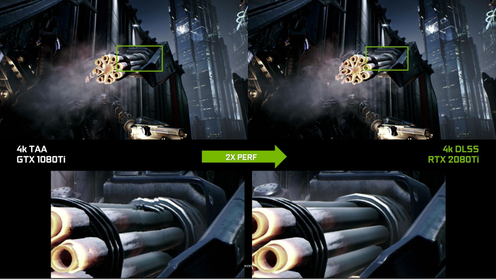 Her kan maskinlæring udføre det arbejde som tidligere blev klaret af anti-aliaserings algoritmer, med det Nvidia kalder DLSS (deep learning super sampling).
