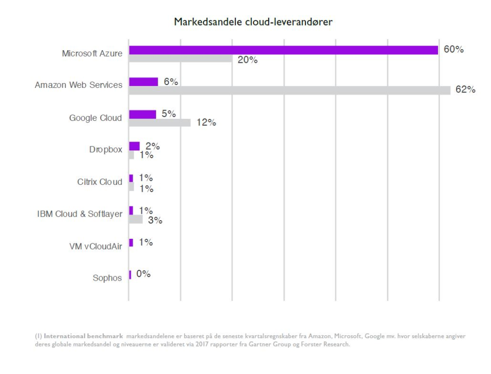 På det danske cloudmarked sidder Microsoft tungt på klart størstedelen af markedet med Microsoft Azure, der har hele 60 procent af markedet for cloudløsninger i Danmark.