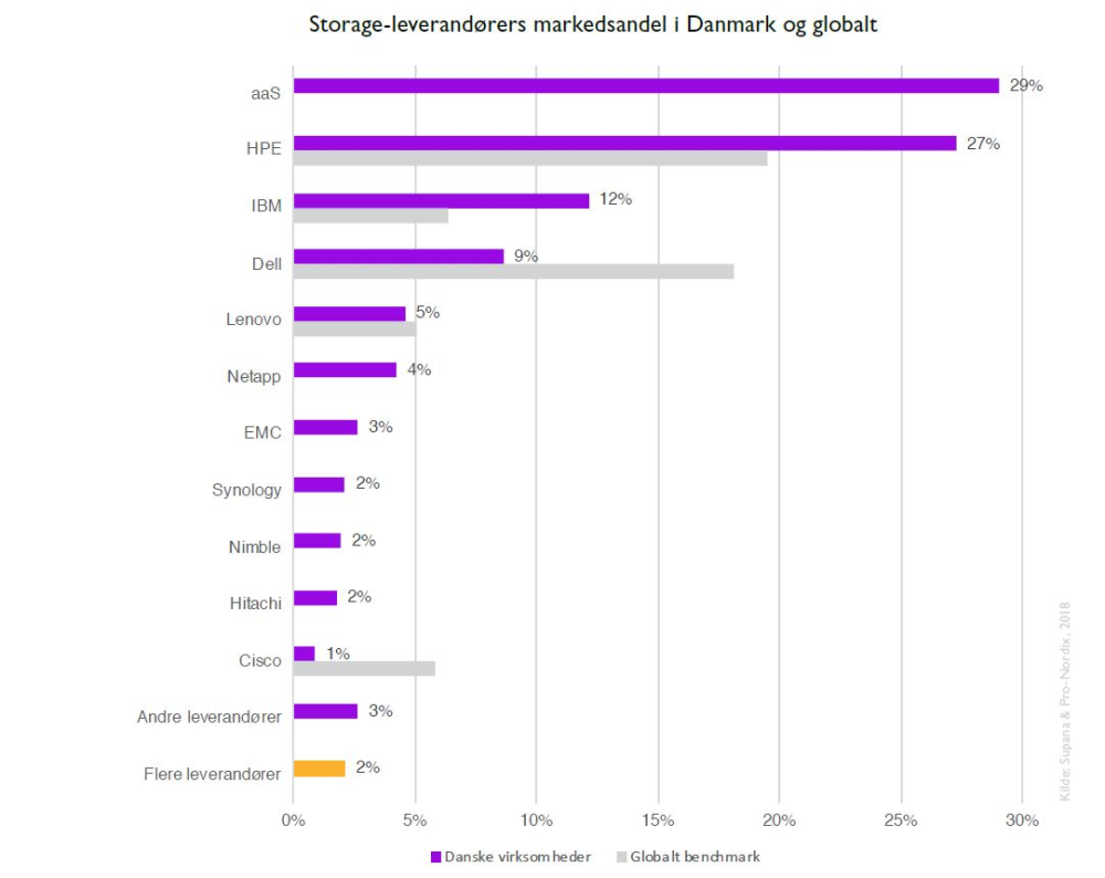 Men næstefter finder vi HPE, der med en markedsandel på 27 procent er den største kendte storage-leverandør i Danmark.