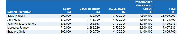 Vi kan således se, at CFO Amy Hoods årløn landede på 13,9 millioner dollar, mens juridisk chef Brad Smith landede en årsløn på i alt 12,5 millioner dollar. Selskabets salgs- og marketingdirektør, Jean-Philippe Courtois, fik en årsløn på 11,4 millioner dollar.
