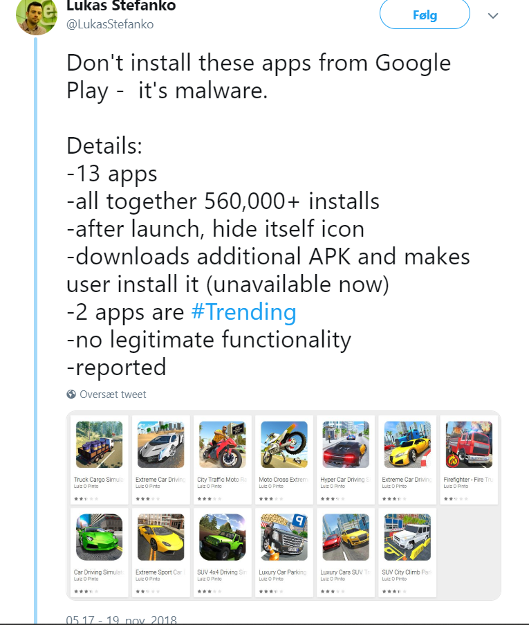 En sikkerhedsforsker hos ESET har netop tweetet detaljerne på 13 spil-apps fra samme udvikler, der til sammen har haft over en halv millioner downloads, der installerer malware på Android-enheder.