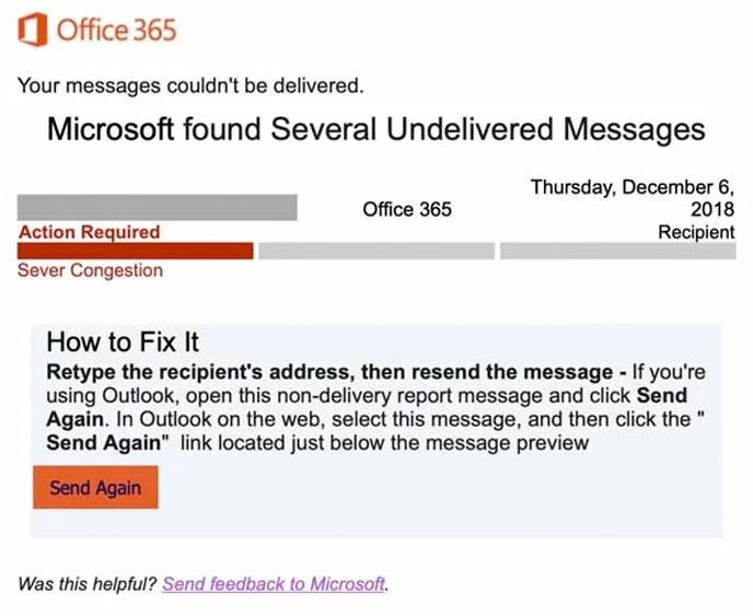 Men herunder kan du se beskeden, du får fra Microsoft, hvis du rent faktisk ikke kan sende din e-mail. Den rigtige notifikation indeholder for eksempel ikke en 'send igen' knap.