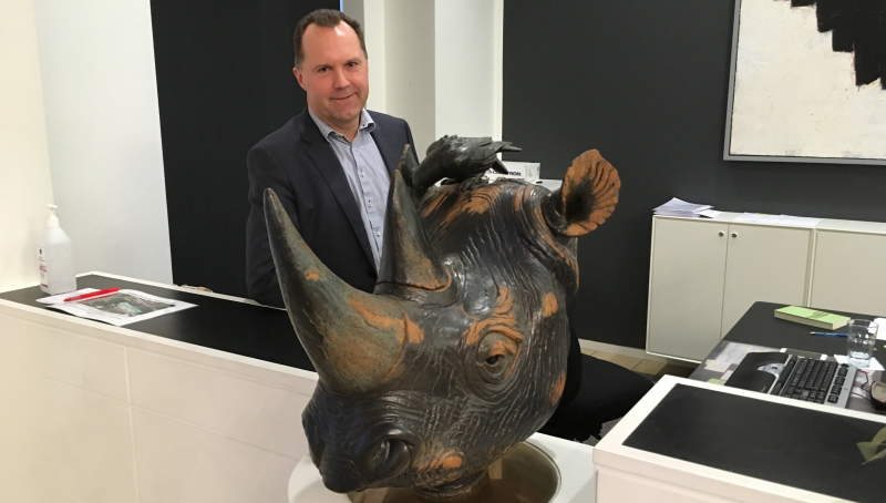 Gert Bendsen, administrerende direktør for Edlund, står her i selskabets reception sammen med næsehornet Brutalis. Brutalis er navnet på Edlunds første it-system. Foto: Christoffer Lund-Hansen (Foto: Christoffer Lund-Hansen)