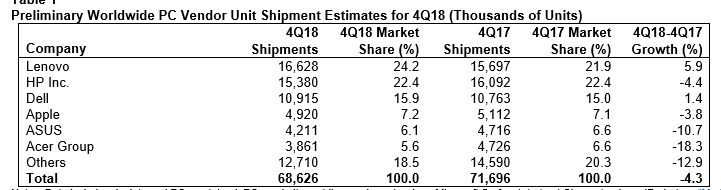 1: Lenovo (24,2 procent, 16,6 millioner solgte enheder i fjerde kvartal)