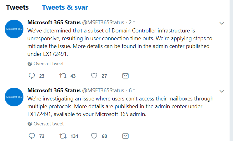 Det oplyser Microsoft via Twitter-kontoen Microsoft 365 Status.