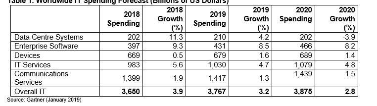 Frem mod 2020 forventer Gartner, at disse vil falde med 3,9 procent som det eneste område, der vil blive ramt af negativ vækst.