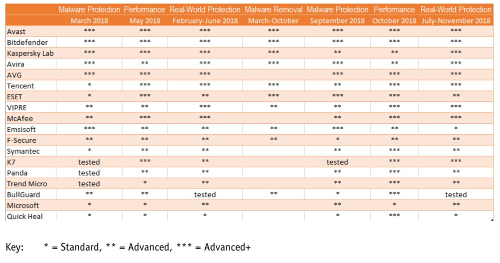 De 18 leverandører der er blevet testet er: Avast, AVG, Avira, Bitdefender, BullGuard, Emsisoft, ESET, F-Secure, K7, Kaspersky Lab, McAfee, Microsoft, Panda, Quick Heal, Symantec, Tencent, Trend Micro, og Vipre.