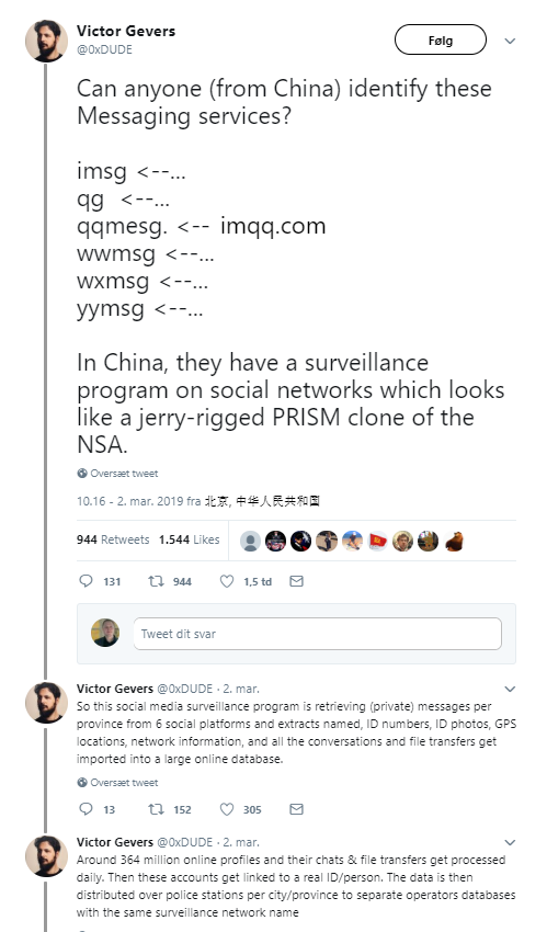 "I Kina har de et overvågningsprogram af sociale netværk som ser ud som en improviseret PRISM-klon fra NSA," skriver Victor Gevers på Twitter.