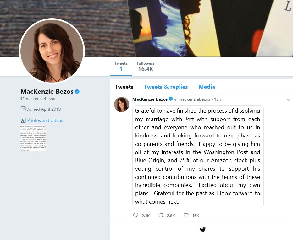 På Twitter skriver MacKenzie Bezos, at hun er ‘taknemmelig over at have afsluttet afslutningsprocessen med Jeff med støtte fra hinanden og alle, der har rakt ud til os med venlighed.’