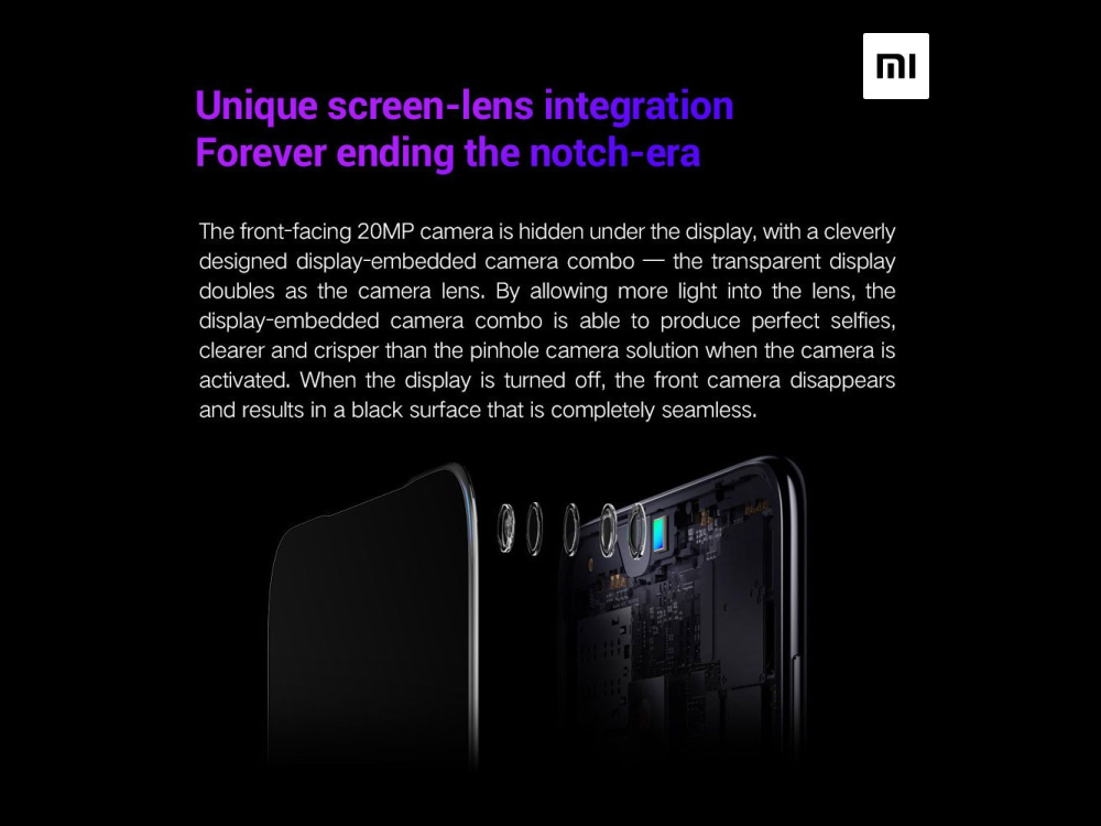 Den kinesiske mobilproducent Xiaomi viser dog hvordan, denne helt kan undgås, ved at benytte en særlig skærmteknologi som gør, at det frontvendte kamera kan gemmes under selve skærmpanelet.