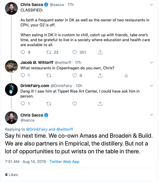 ”Vi er medejere af Amass og Broaden & Build. Vi er også partnere i destilleriet Empirical,” skriver han på Twitter.