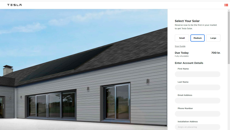Og nu kan danske husejere også forudbestille et anlæg. Tesla har netop åbnet for et bestillingssite, hvor man for 700 kroner kan melde sig som interesseret i et anlæg i en af tre mulige størrelser.