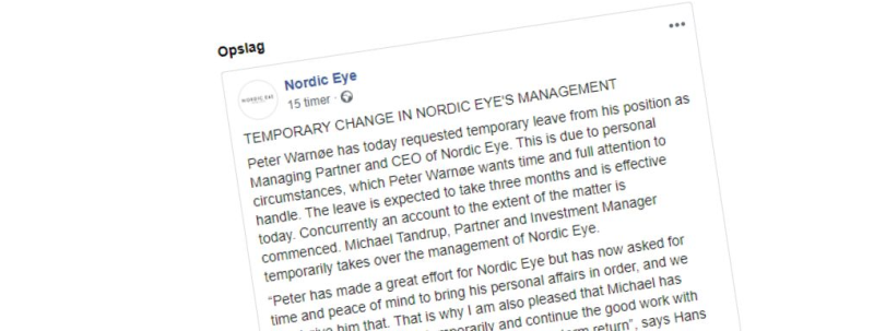 I et engelsksproget opslag på Facebook - som du finder her - meddeles det, at ‘Peter Warnøe [...] har anmodet om midlertidig orlov fra sin position som managing partner og CEO i Nordic Eye.’