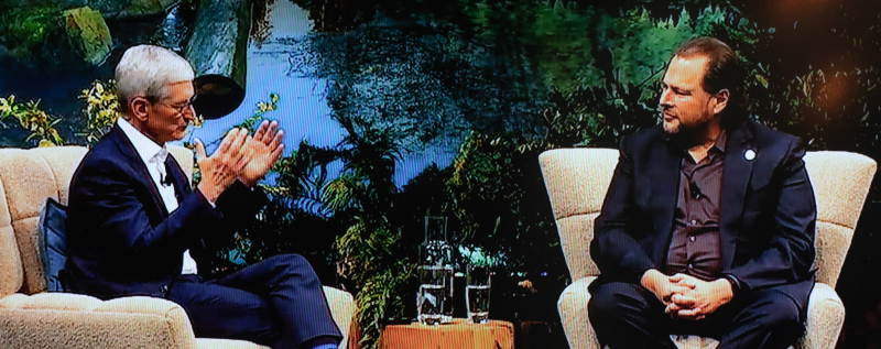 Men så trykkede Marc Benioff på Tim Cooks knap med et spørgsmål om innovation, forandring, og hvad der er Apples hemmelighed.