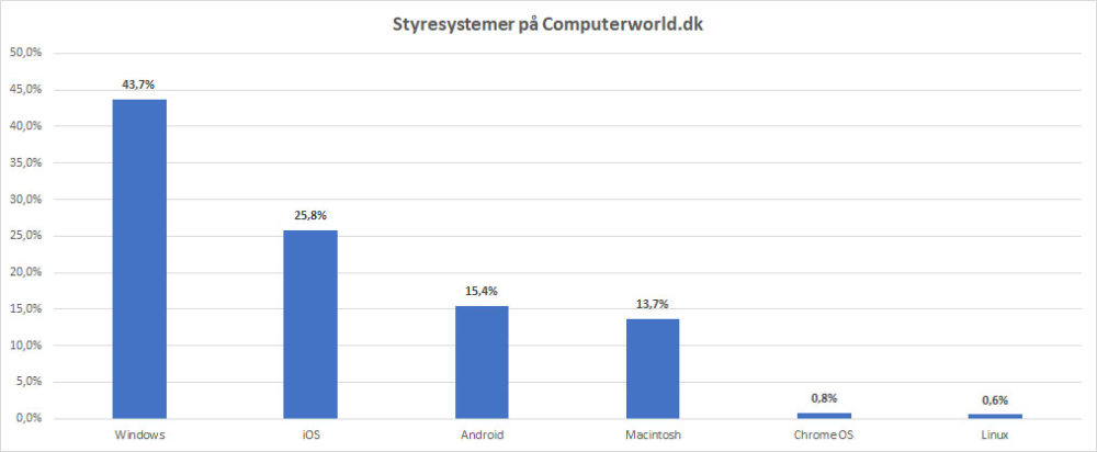 Herunder kan du se den seneste opgørelse af, hvordan vores læsere fordeler sig på de forskellige styresystemer og de forskellige Windows-versioner.