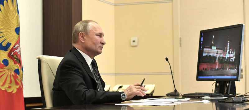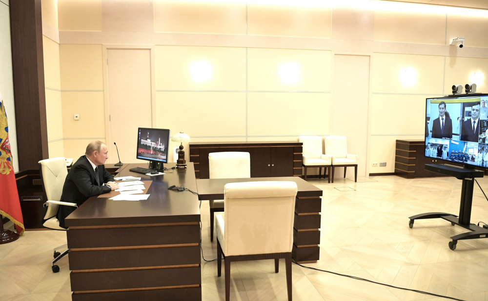 Her ses præsidenten i færd med en videokonference, og i venstre side på skrivebordet står en tændt pc-skærm, hvor XP’s lyseblå taskbar lyser nydeligt op under et aftenbillede af Kreml med løgkupler og hele udtrækket.