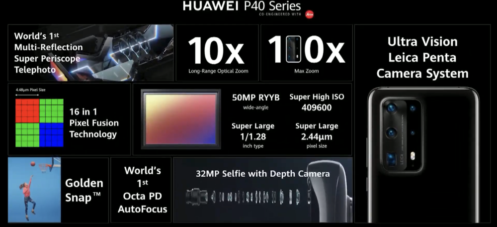 Her forenes både 3x og 10x teleoptikker med en hovedsensor på 50 MP med en ny kamerasensor, der tager 40 procent mere lys ind end i efterårets Mate 30 Pro.