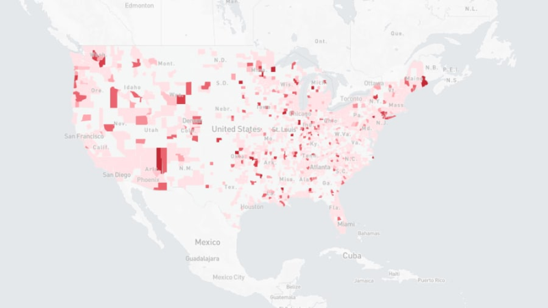 På kortet, som i øjeblikket dækker over USA, kan der ses et overblik over smittede ned til de enkelte byområder, skriver amerikanske CNBC.