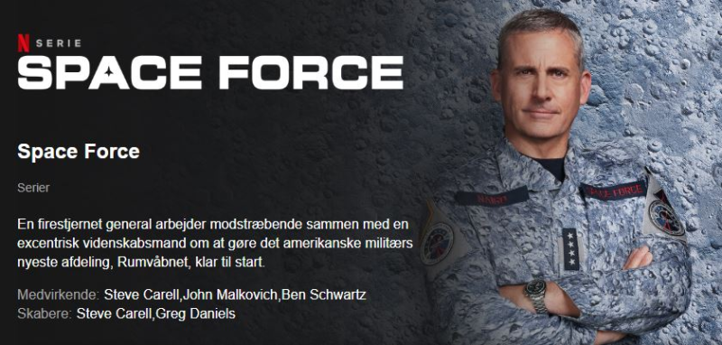 Med Steve Carell i rollen som den noget utilfredse general Naird og John Malkovitch som hans excentriske videnskabelige chefrådgiver ser Netflix’ nyeste komediesatsning Space Force ganske lovende ud.
