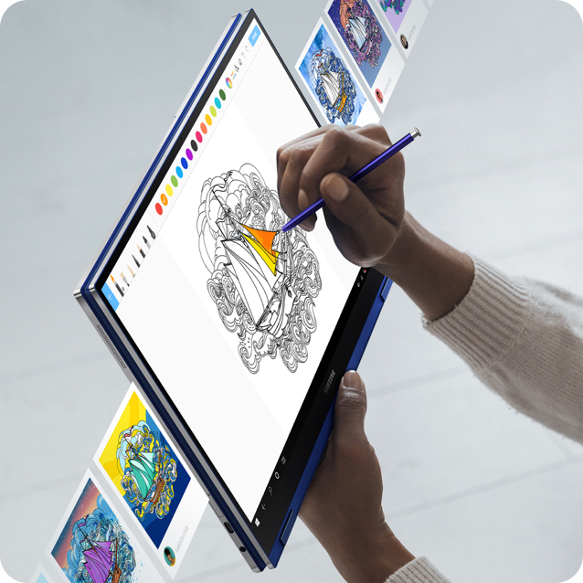 Her bydes der på en maskine med touchskærm og 360 graders hængsel der kan bijobbe som tablet og tegneplade sammen med Samsungs S-pen.