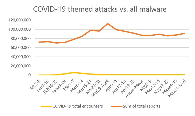 Microsoft sikkerheds-team kalder selv omfanget af Covid-19-relaterede malware-angreb for så lille, at det knap nok er et ‘blip’ af den samlede mængde trusler, som typisk måles i løbet af en måned.