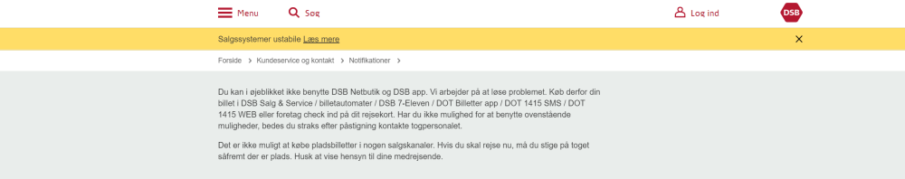 "Det er hverken muligt at købe rejser eller pladsbilletter på dsb.dk eller i DSB app. Køb derfor din billet til rejsen i DSB Salg & Service, billetautomater, DSB 7-Eleven, DOT Billetter app eller foretag check ind på dit rejsekort. Har du ikke mulighed for at benytte ovenstående muligheder, bedes du straks efter påstigning kontakte togpersonalet," står der i meddelelsen på hjemmesiden, som fortsætter: