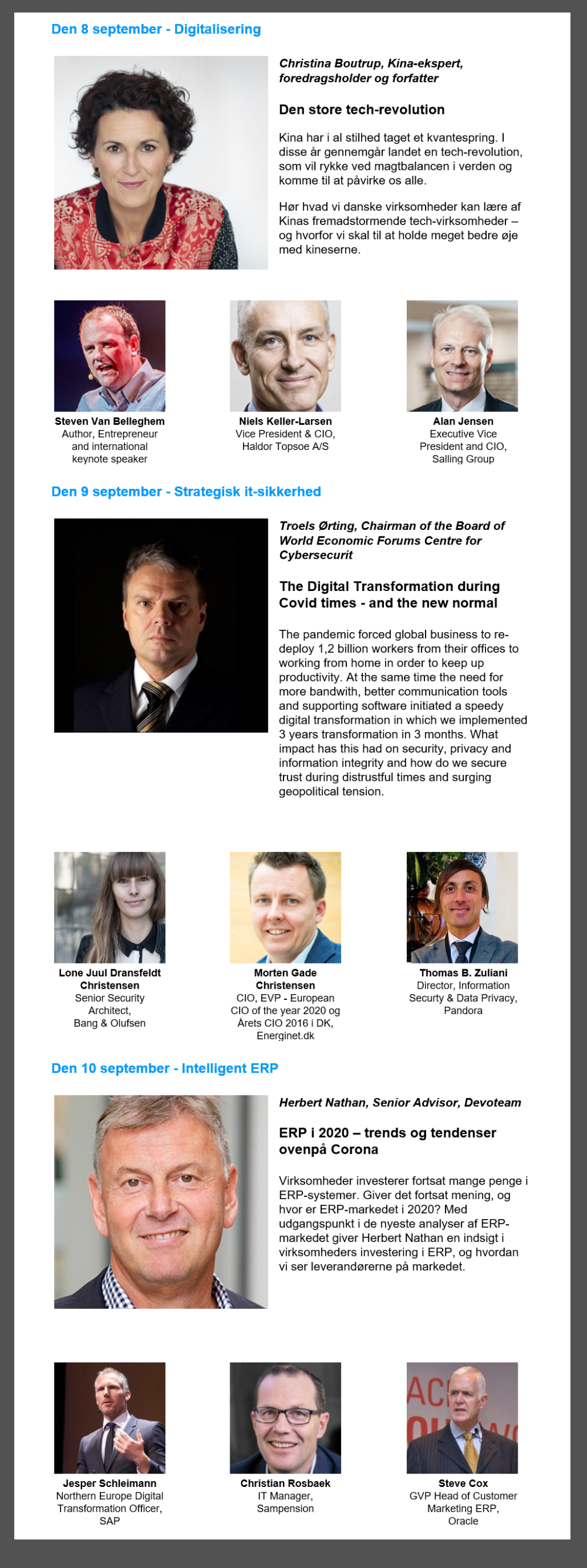 Derfor kan du 8., 9. og 10. september 2020 læne dig tilbage i kontorstolen og blive inspireret, når nogle af Danmarks bedste CIO'er, CISO'er og leverandører går live i det digitale Computerworld Summit-studie.