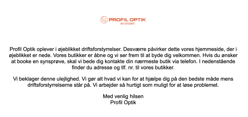 Det er ikke muligt at tilgå Profil Optiks hjemmeside. I stedet bliver brugerne mødt med en besked om, at det skyldes driftsforstyrrelser.