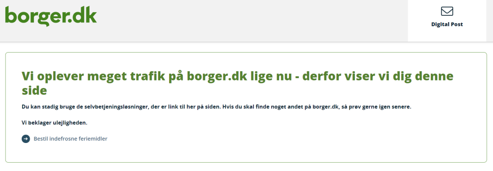 "Vi oplever meget trafik på borger.dk lige nu - derfor viser vi dig denne side. Du kan stadig bruge de selvbetjeningsløsninger, der er link til her på siden. Hvis du skal finde noget andet på borger.dk, så prøv gerne igen senere," lyder teksten, før man kan trykke sig videre til udbetalingssystemet.