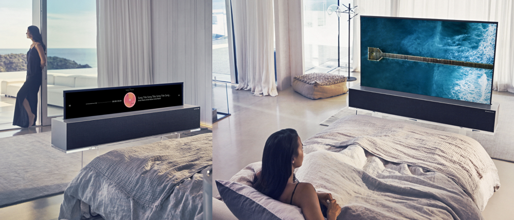 For de penge får man også fjernsynet ’LG Signature OLED R’, hvis særkende er, at det kan pakke sine 65 tommers OLED-skærm helt af vejen, ved at sammenrulle sig selv ned i sin base.