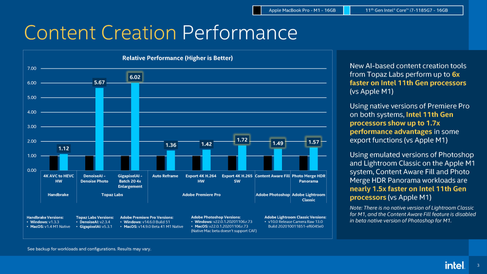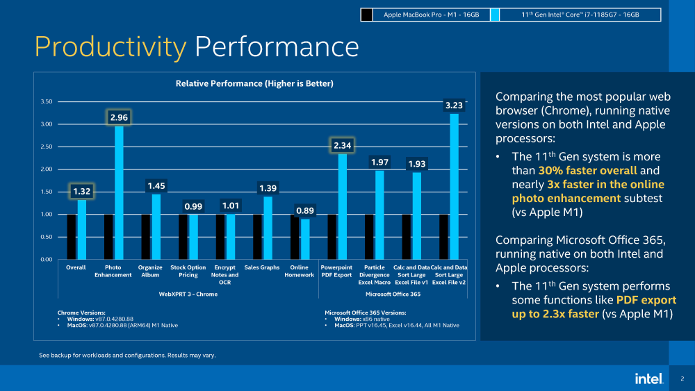 Ifølge Intel skulle selskabets nyeste processor til slanke og lette maskiner, Core i7 1185G7, være op til 3,23 gange hurtigere til kontoropgaver som visse Excel-udregninger, mens de overordnet set skulle uydes 30 procent højere i Intels nye top-processor.