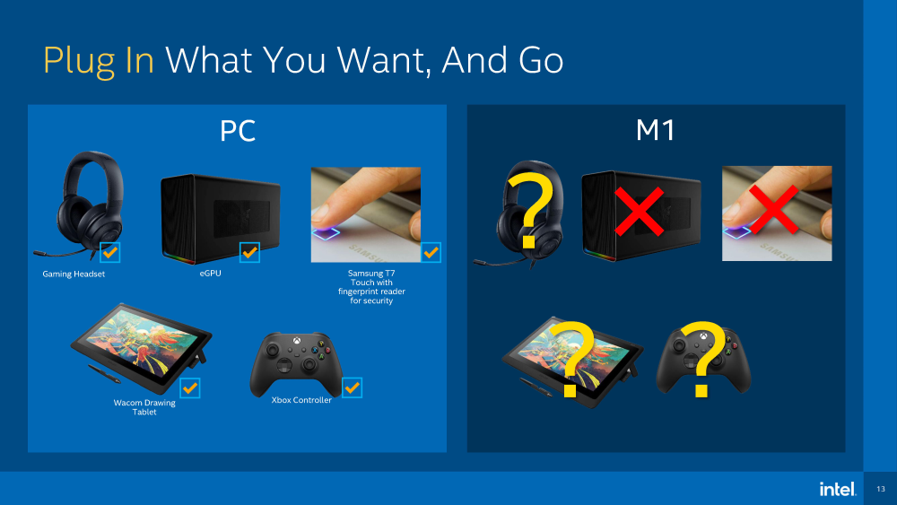 Intels sidste bredside mod Apple går på M1-maskinernes manglende evner, når det gælder tilslutninger. Her minder Intel om, at Apples nye maskiner kommer til kort, når der skal sluttes eksternt tilbehør som mere end en skærm, spillekontrollers, e-GPU og meget andet tilbehør igennem den manglende Thunderbolt-port.