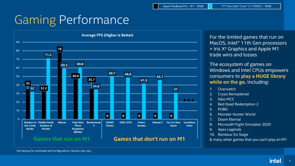 Det understreger Intel også ved at vise, både hvordan der kan ydes højere i en række udvalgte spil, men særligt hvordan M1-baserede maskiner slet ikke kan afvikle nogle af dagens mest populære spil.