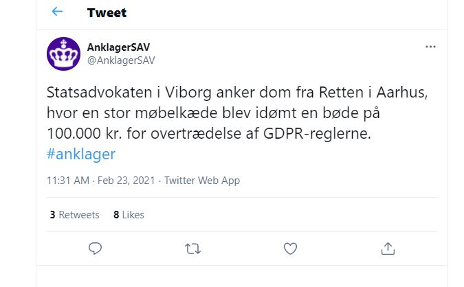 “Statsadvokaten i Viborg anker dom fra Retten i Aarhus, hvor en stor møbelkæde blev idømt en bøde på 100.000 kroner for overtrædelse af GDPR-reglerne,” meddeler Statsadvokaten i Viborg kort på Twitter.