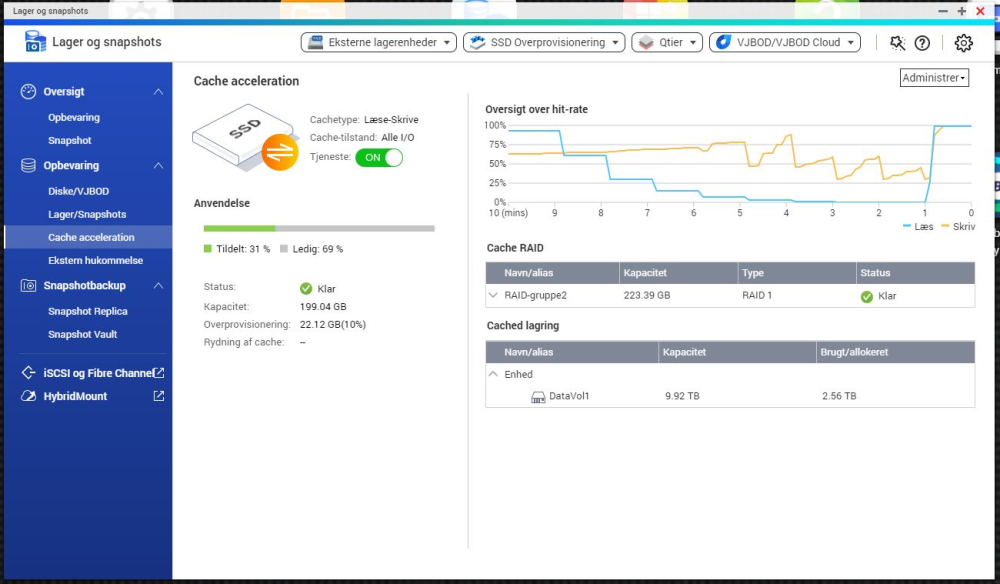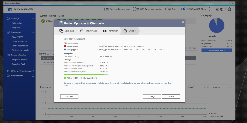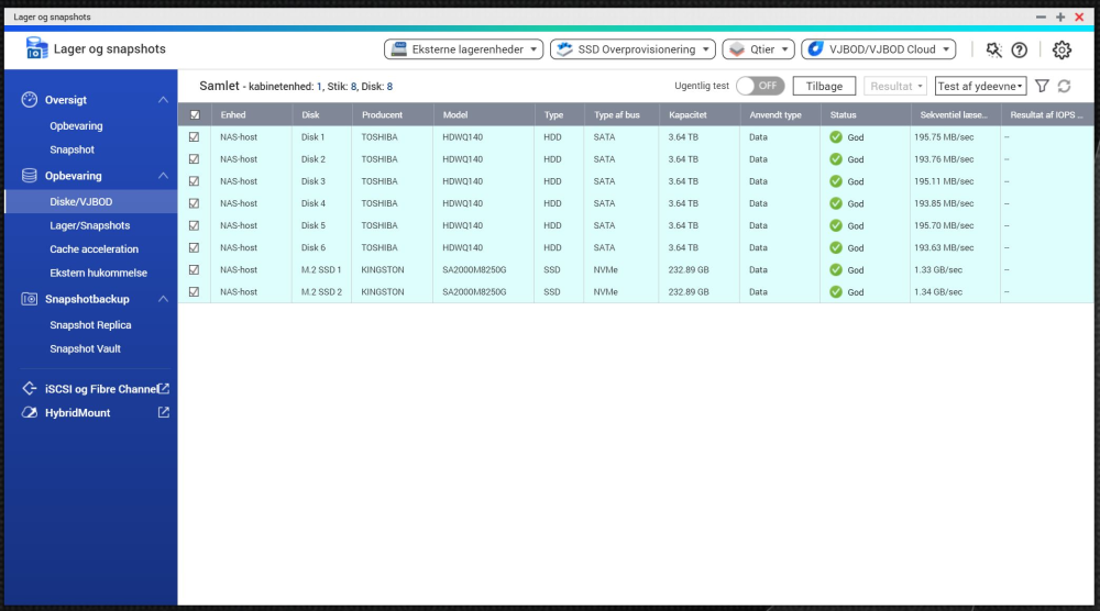 Første opsætning var med seks SATA-diske i RAID 10 og to SSD-diske sat op med Qnaps såkaldte Qtier-løsning.