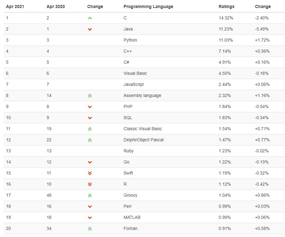 Her ser du hele Tiobe-indekset for april 2021.