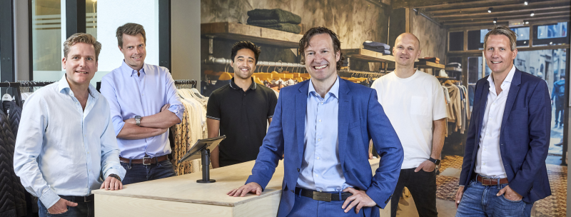 Fra venstre: Einar Andreas Negaard (CFO), Simen Bøhmer (CTO), Lars Mapoy (CEO), Erik Tomren, CEO i EG Retail, Haakon Skavhaug-Flender (CPO), Marius Lindholt (CEO). Foto: Sveinung Bråthen. (Foto: ©Fotograf Sveinung Bråthen Pressebilder for Front Systems as / Fotograf Sveinung Bråthen)